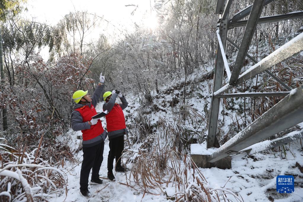 1月16日,在銅陵市義安區天門鎮,國網安徽省電力公司運維人員觀測輸電線路覆冰情況。
