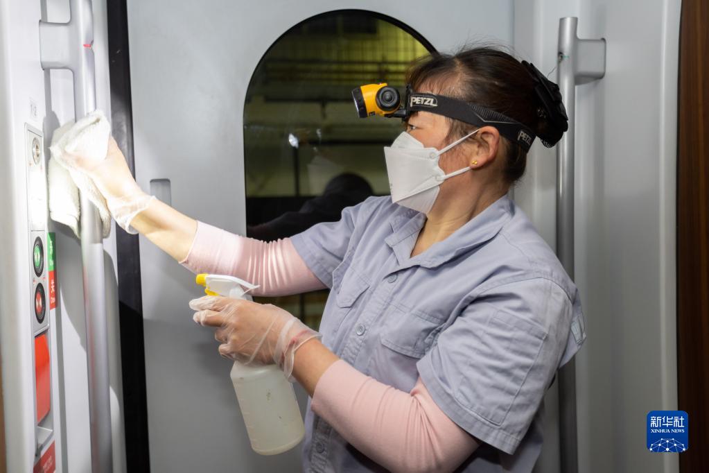 春運期間,上海華鐵旅客服務有限公司工作人員對入庫終到上海動車段虹橋動車運用所的動車組列車開展消毒清潔作業,守護平安健康春運。