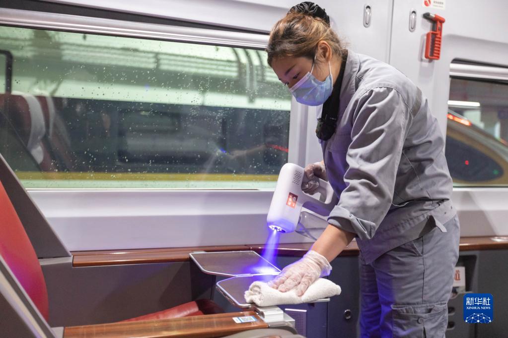 春運期間,上海華鐵旅客服務有限公司工作人員對入庫終到上海動車段虹橋動車運用所的動車組列車開展消毒清潔作業,守護平安健康春運。