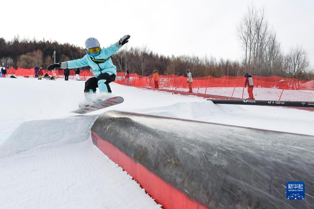 都軒銘在吉林省吉林市萬科松花湖度假區V-PARK地形公園挑戰場地道具(2023年1月14日攝)。