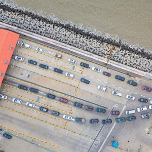 1月16日,車輛在海南省??谑行阌⒏叟抨牭群虻谴鰨u(無人機照片)。
