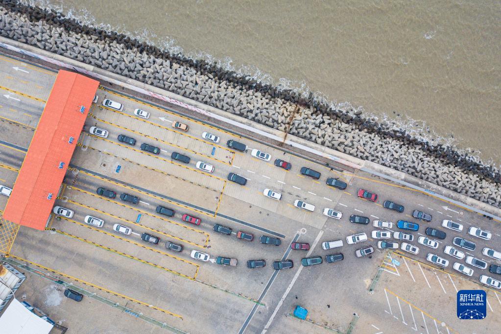 1月16日,車輛在海南省??谑行潞8叟抨牭群虻谴鰨u(無人機照片)。