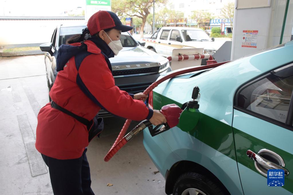 1月17日,云南省蒙自市一加油站工作人員給汽車加油。
