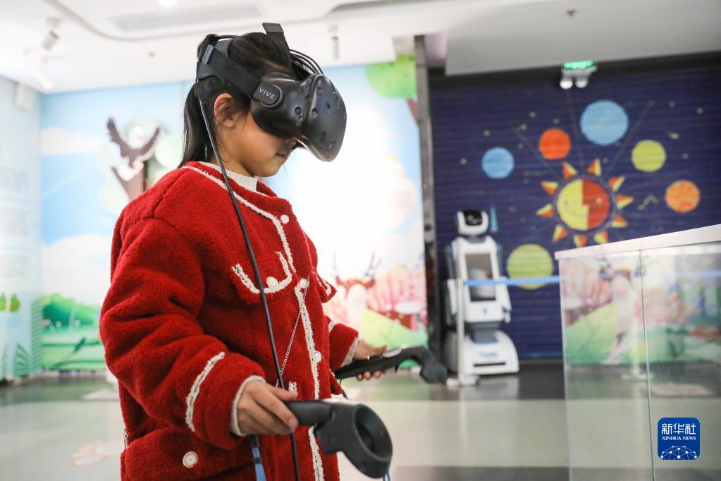 1月17日,一名小朋友在河南省寶豐縣科技館體驗VR游戲。