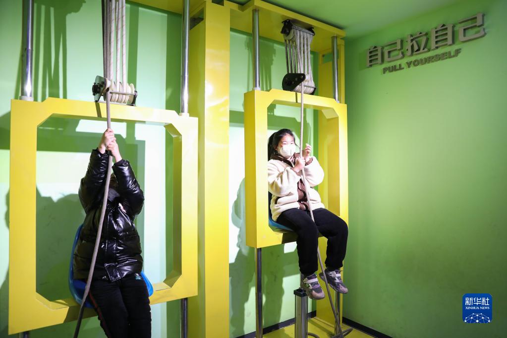 1月17日,兩名小朋友在河南省寶豐縣科技館體驗“自己拉自己”器材。