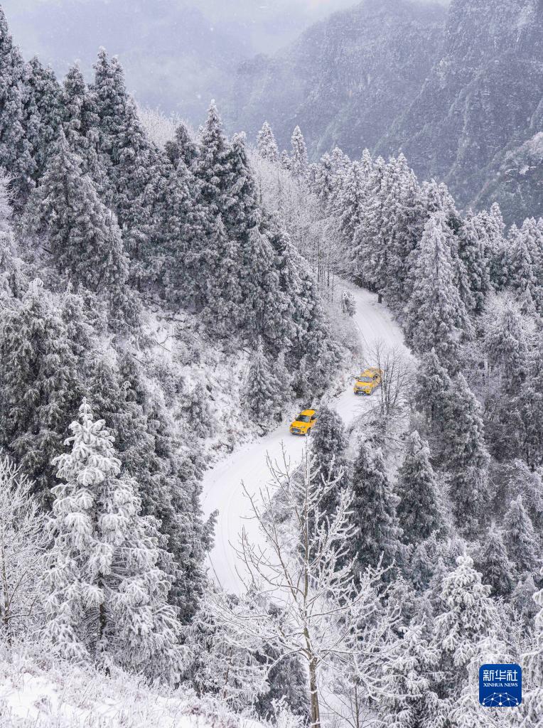 1月17日,在湖北省鶴峰縣,應急搶險人員駕車穿行在林區小路上。