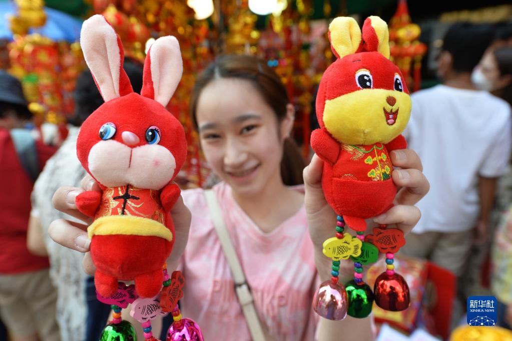 1月16日,一名顧客在泰國曼谷唐人街展示春節飾品。