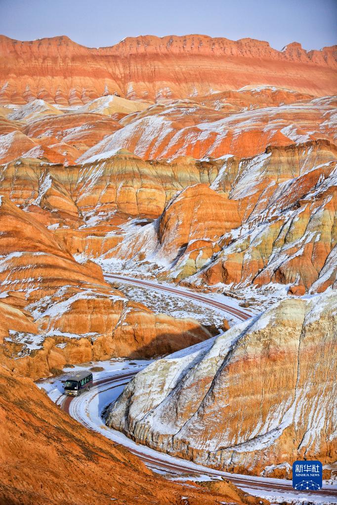 甘肅張掖七彩丹霞在白雪的映襯下顯得格外艷麗(1月15日攝)。