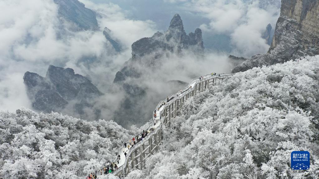 1月16日,游客在湖南省張家界天門山風景區觀賞雪后美景(無人機照片)。