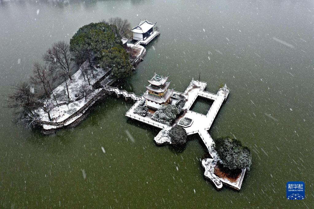 1月15日拍攝的安徽省銅陵市天井湖雪景(無人機照片)。