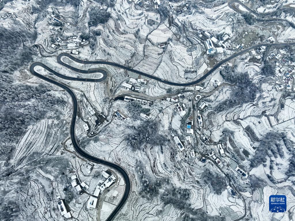 1月16日在湖北省宜昌市秭歸縣茅坪鎮拍攝的雪后鄉村及盤山公路(無人機照片)。