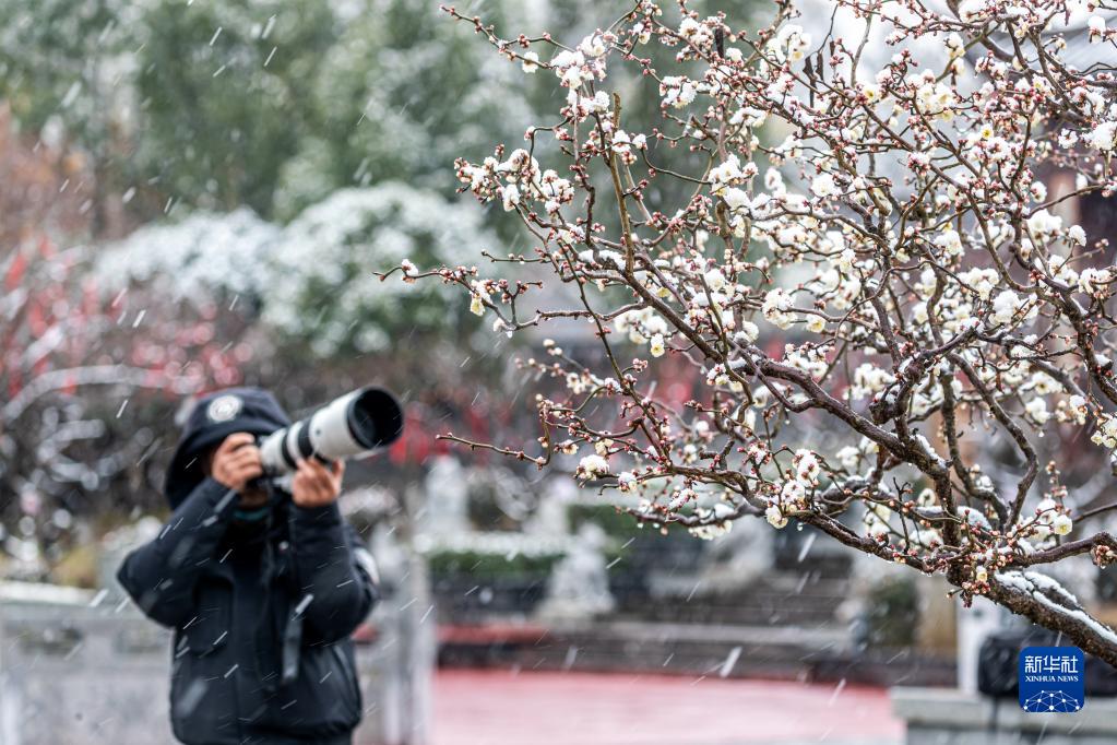 1月15日,在重慶市南川區大觀鎮鐵橋村,攝影愛好者在雪中拍攝梅花。