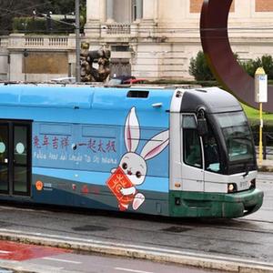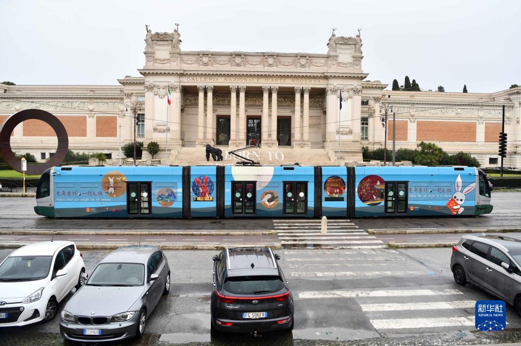當日,兔年春節主題電車亮相意大利首都羅馬,慶祝即將到來的中國農歷新年。