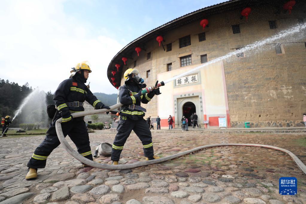 當日,福建省龍巖市永定區消防救援大隊舉行土樓滅火救援實戰演練。演練結合土樓建筑的火災特性,涵蓋人員疏散、滅火救援、火場供水、隱患排查等,保障節日期間土樓古建筑消防安全。