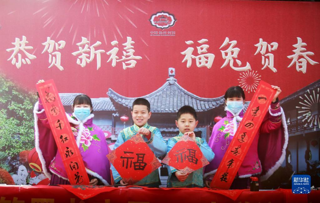 1月18日,在江蘇省揚州市何園景區,導游和小朋友一同展示春聯和福字。