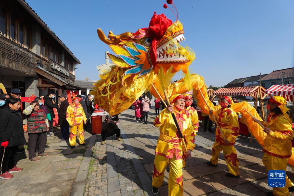 1月18日,在浙江省湖州市德清縣鐘管鎮蠡山村,民間藝人在“文化進萬家 非遺過大年”活動中為村民表演舞龍。