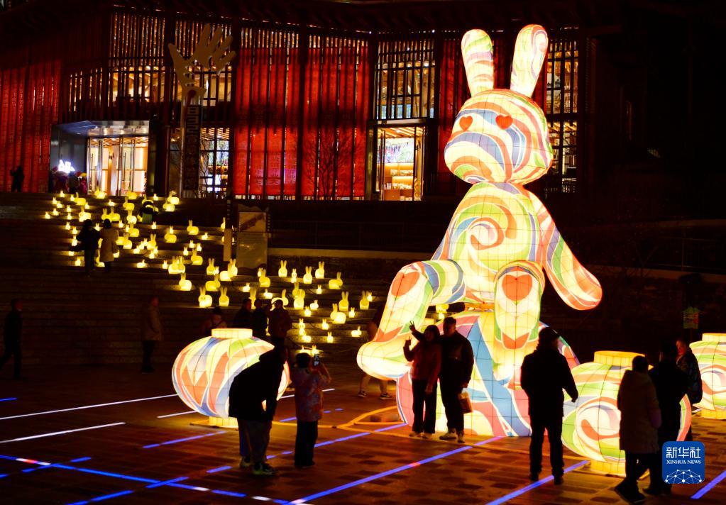 1月17日晚,人們在湖北省宣恩縣城興隆老街觀看兔元素彩燈。