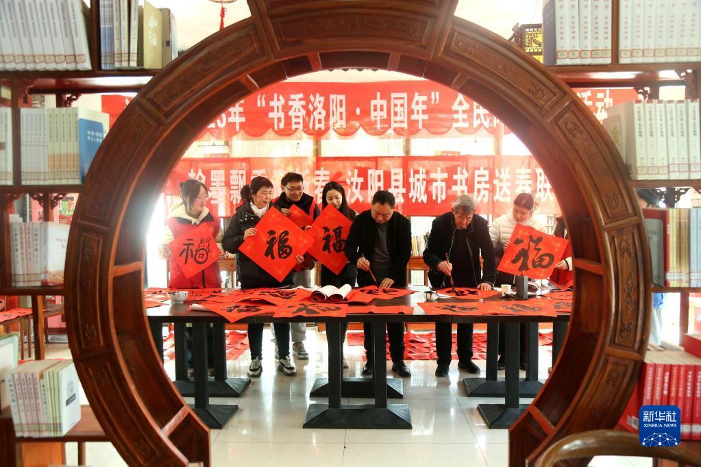 1月18日,在河南省洛陽市汝陽縣城市書房,當地書法家給青少年讀者書寫春聯。