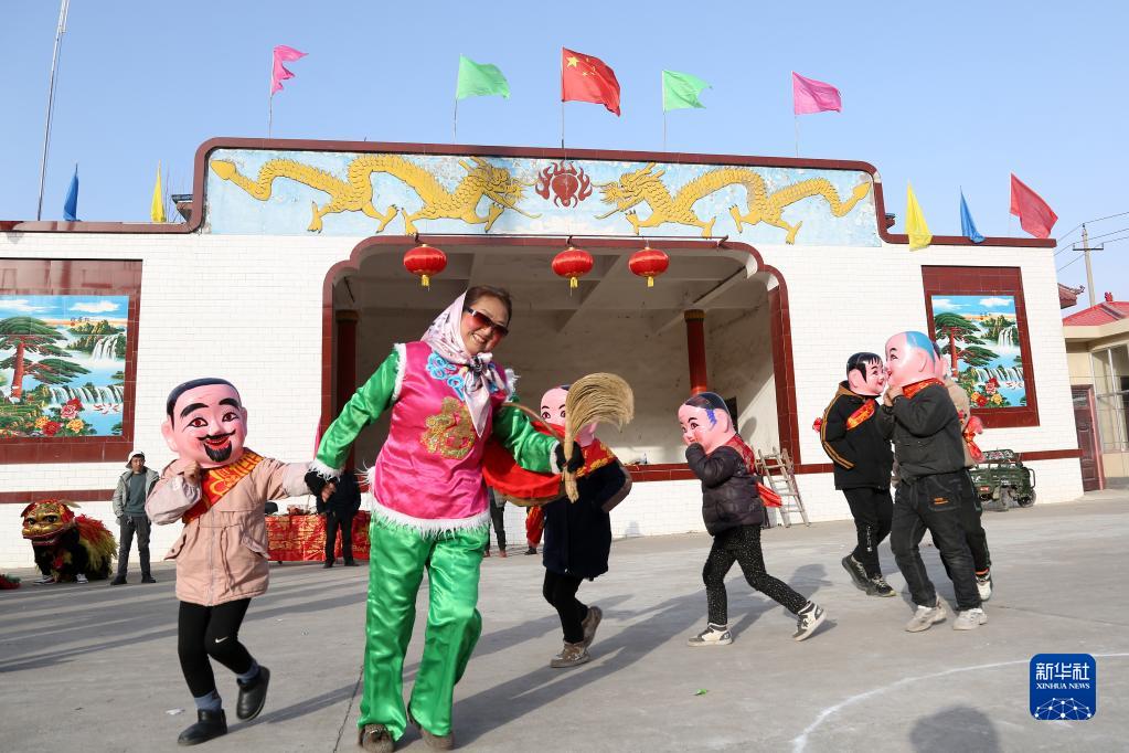 1月18日,甘肅省平涼市崆峒區四十里鋪鎮洪岳村社火隊在村文化廣場排練社火節目。