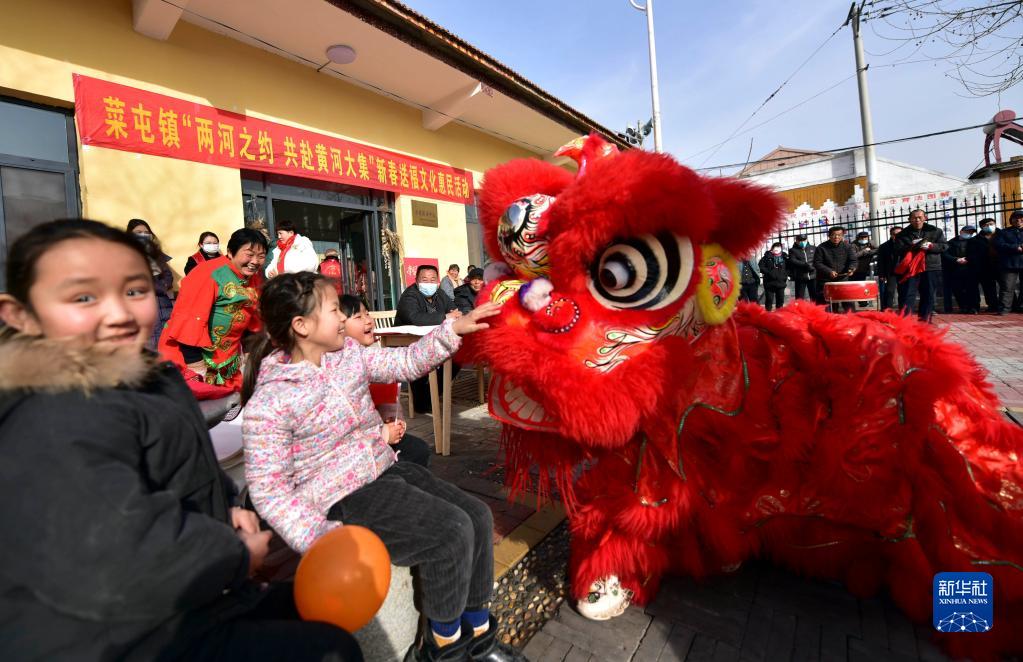 1月17日,在山東省聊城市茌平區菜屯鎮鳳凰新村,小朋友同舞獅表演進行互動嬉戲。