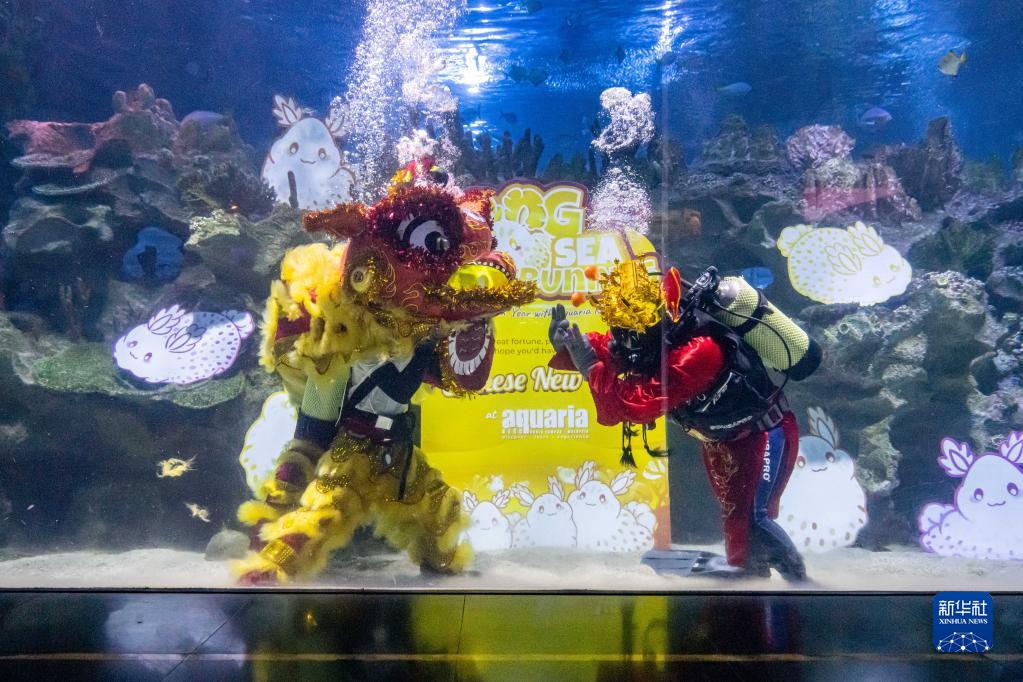 1月18日,潛水員在馬來西亞吉隆坡城中城水族館進行水中舞獅和“財神”拜年表演。