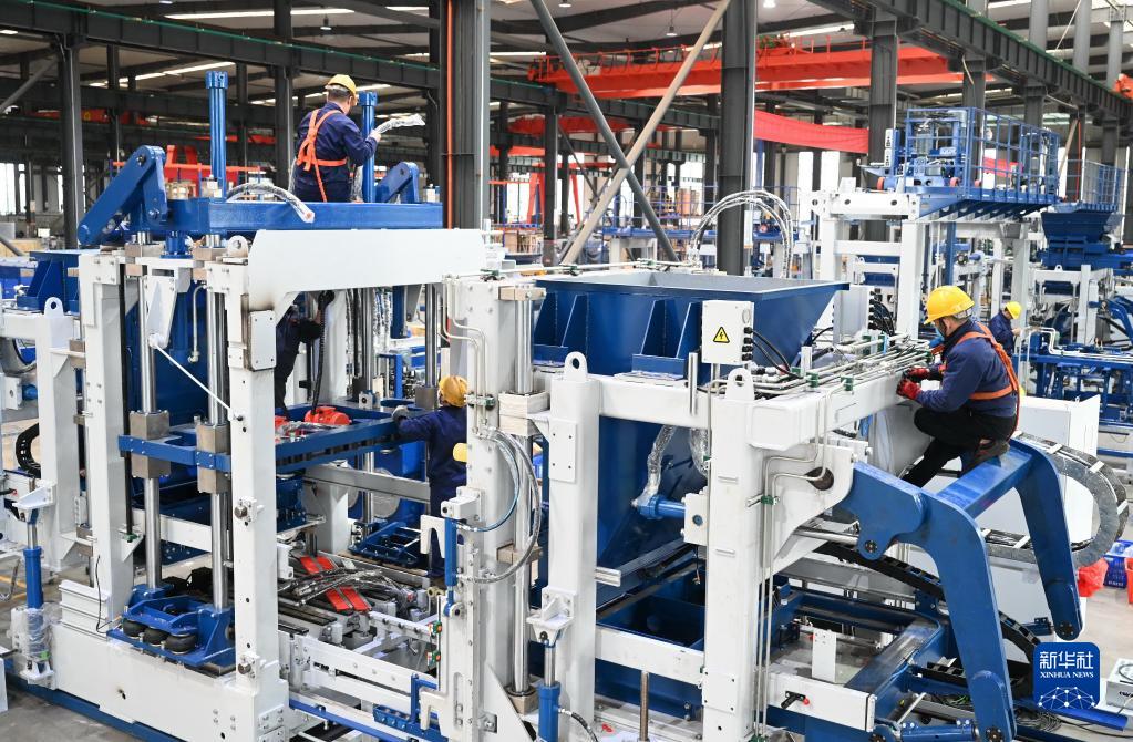 福建泉工股份有限公司工作人員在安裝銷往海外的全自動砌塊成型機(2022年12月14日攝)。