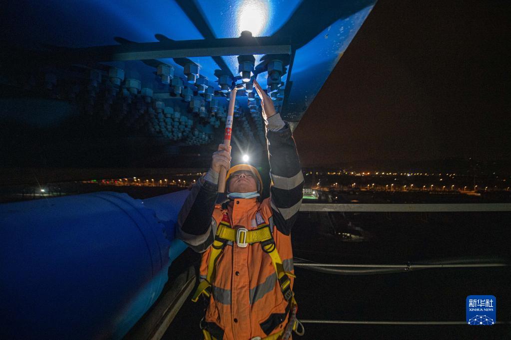 近日,浙江省迎來降溫天氣。鐵路寧波工務段椒江橋隧工區的工人們利用夜間高鐵線路的“天窗期”,頂著冬夜的寒風對杭臺高鐵椒江特大橋進行全方位檢查,確保線路安全。