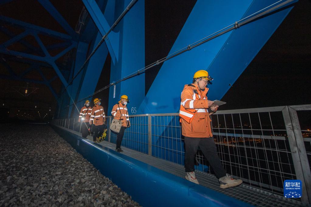 近日,浙江省迎來降溫天氣。鐵路寧波工務段椒江橋隧工區的工人們利用夜間高鐵線路的“天窗期”,頂著冬夜的寒風對杭臺高鐵椒江特大橋進行全方位檢查,確保線路安全。