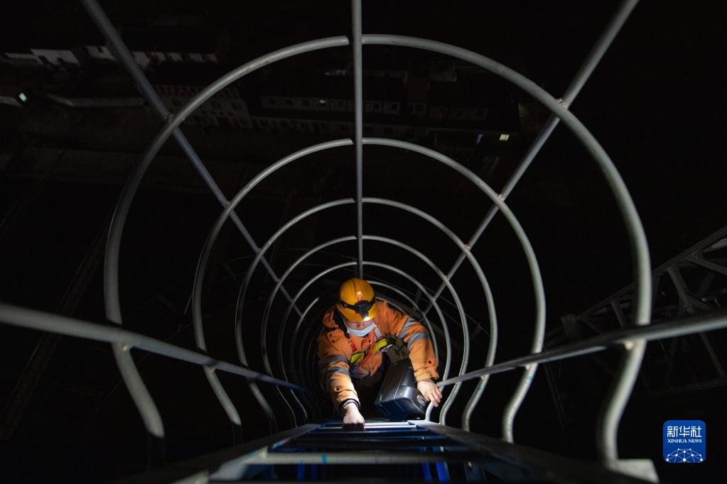 1月18日凌晨,鐵路工人爬下檢修梯,準備對杭臺高鐵椒江特大橋橋墩進行檢查。