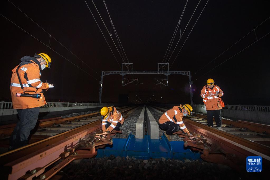 近日,浙江省迎來降溫天氣。鐵路寧波工務段椒江橋隧工區的工人們利用夜間高鐵線路的“天窗期”,頂著冬夜的寒風對杭臺高鐵椒江特大橋進行全方位檢查,確保線路安全。