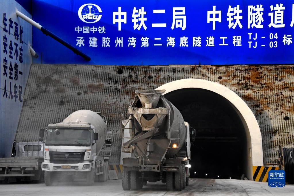 1月17日,運送水泥的工程車輛準備從施工隧道進入海底。