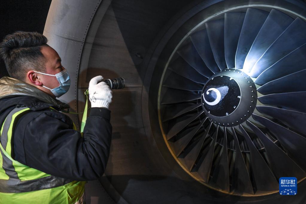 1月17日晚,在貴陽龍洞堡國際機場,南方航空的機務人員對飛機部件進行除冰前檢查。