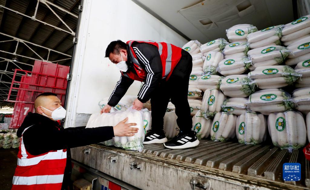 1月17日,在上海江橋蔬菜批發市場內,批發商王加中(右)將來自重慶的白蘿卜卸下貨車。