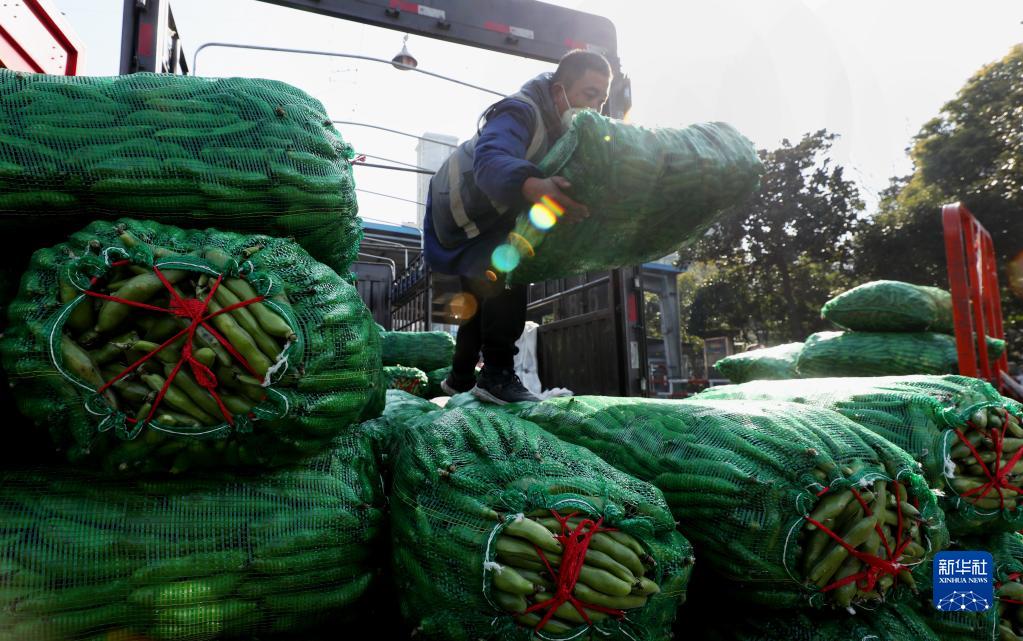 1月17日,在上海江橋蔬菜批發市場內,一位客商將來自云南的蠶豆從卡車上卸下。