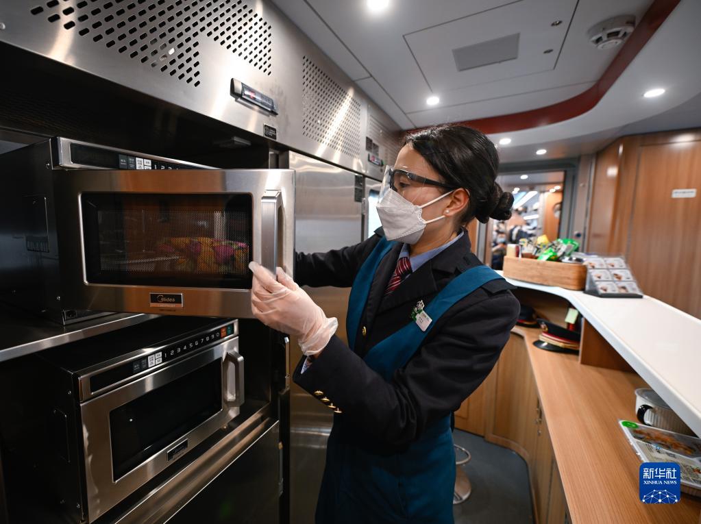 1月17日,在D856次列車上,姐姐韓佳在餐車加熱乘客預定的餐食。