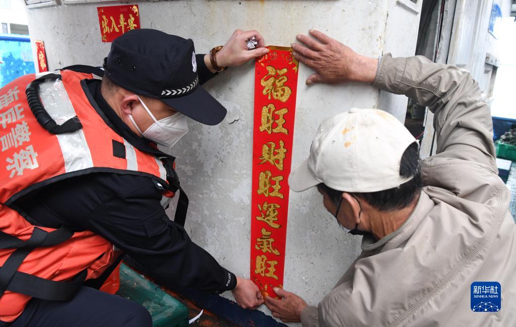 1月18日,在??谛赂鄞a頭,海南省公安廳海岸警察總隊第一支隊民警同漁民一起貼春聯。