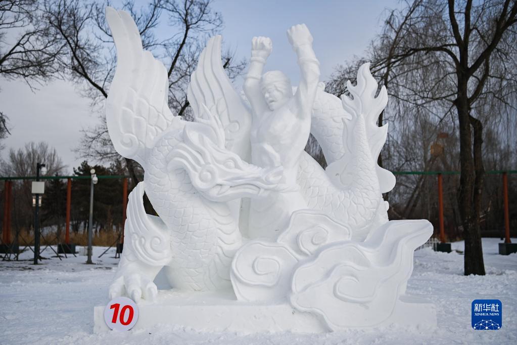 1月18日拍攝的第二十九屆全國雪雕比賽二等獎作品《黑龍傳說》。