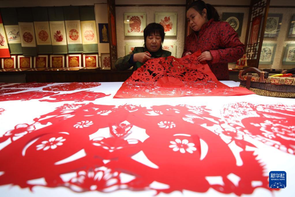 1月18日,在承德市雙橋區俊鳳剪紙創作室,剪紙藝人石俊鳳(左)創作賀歲迎春生肖兔主題剪紙作品。