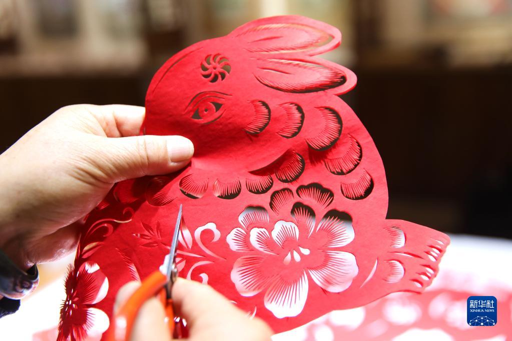1月18日,在承德市雙橋區俊鳳剪紙創作室,剪紙藝人石俊鳳創作賀歲迎春生肖兔主題剪紙作品。
