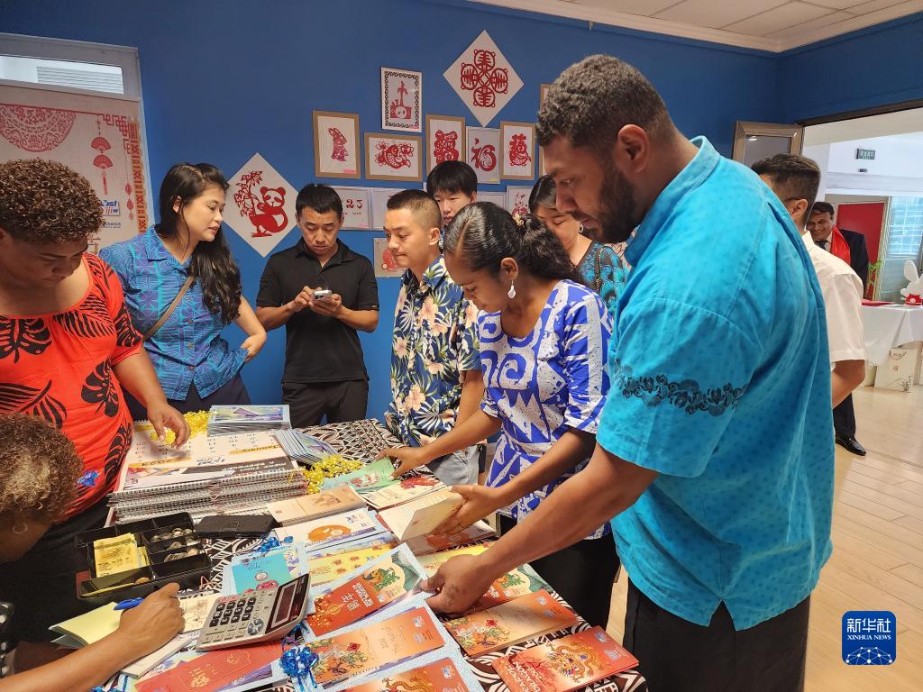 1月18日,在斐濟首都蘇瓦的斐濟中國文化中心,嘉賓們在中國農歷兔年生肖郵票及首日封發行儀式上選購。