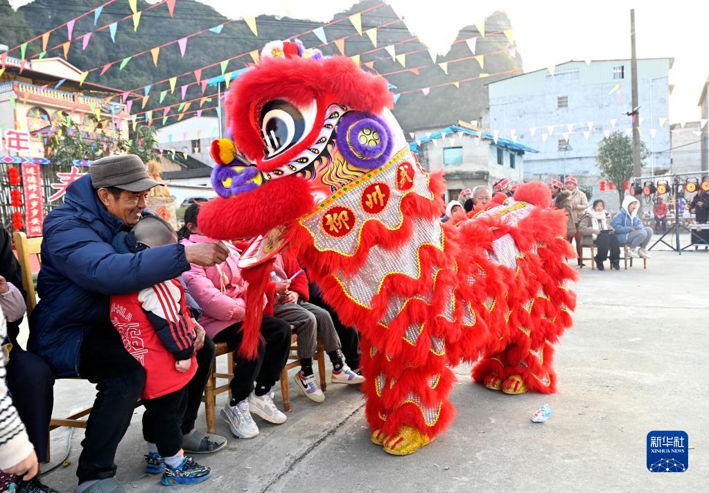 1月17日,村民在“村晚”活動上與舞獅表演者互動。