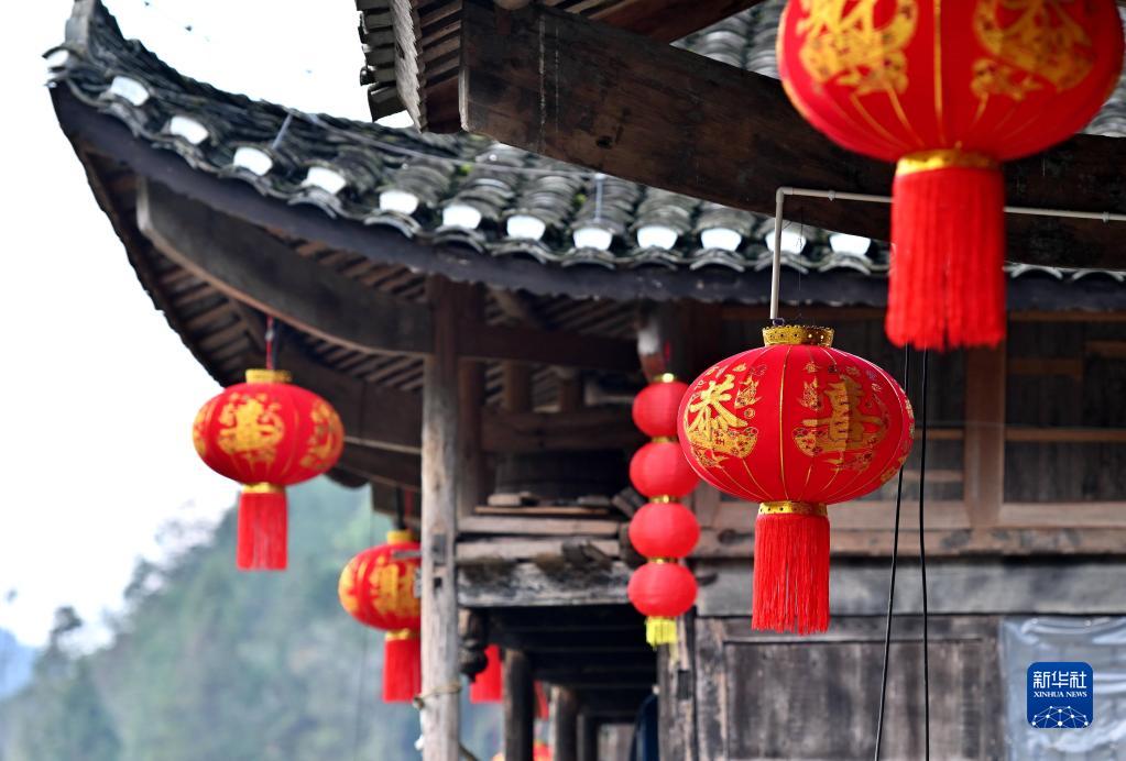 湖北省宣恩縣沙道溝鎮彭家寨吊腳樓懸掛著紅燈籠(1月18日攝)。