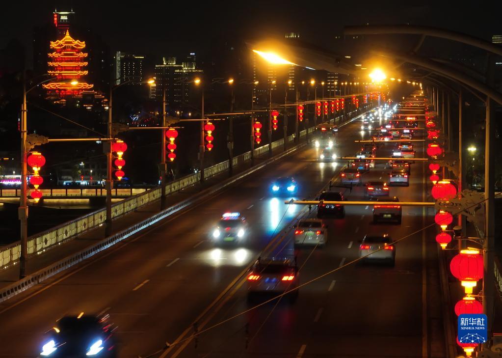 湖北省武漢市黃鶴樓附近路段夜景(1月17日攝,無人機照片)。