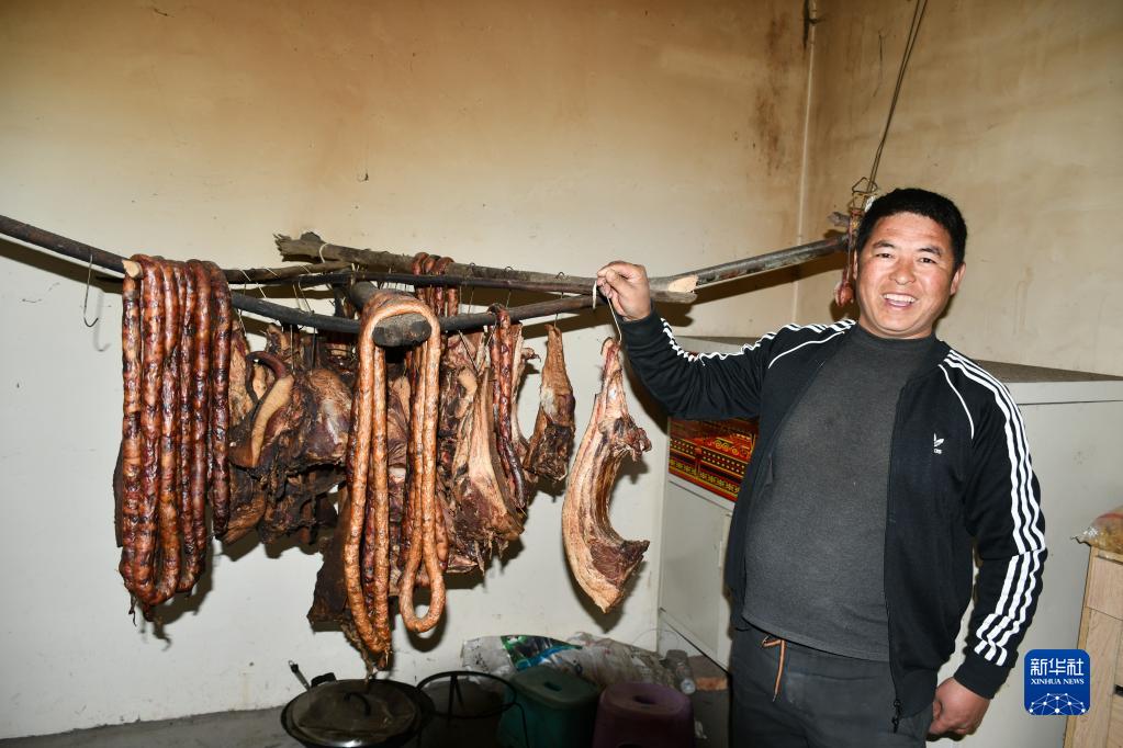 1月12日,巫其石且展示新做好的香腸臘肉。新華社記者 謝佼 攝