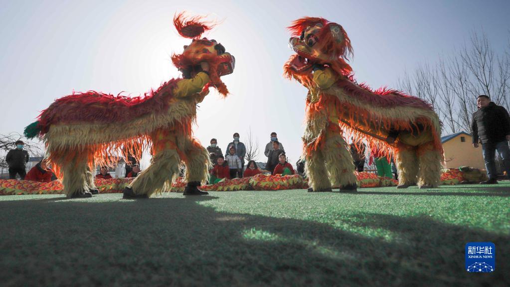 1月18日,遵化市建明鎮穆家莊村的民間藝人在表演舞獅。
