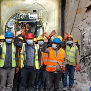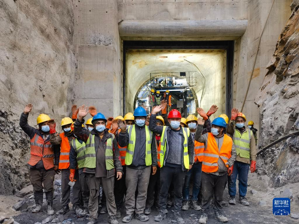1月18日,工人慶祝尼泊爾塔納湖水電站第2標段項目完成尾水洞襯砌混凝土澆筑。
