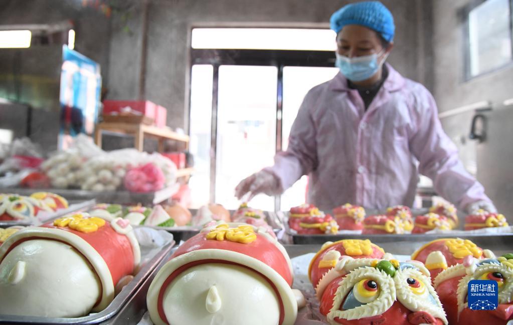 1月19日,在河南省濟源市北海街道一處面點作坊,工作人員在擺放剛出籠的花饃。