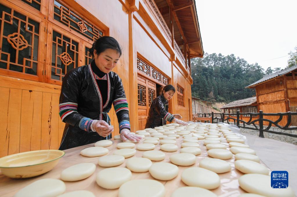 1月18日,貴州省黔東南苗族侗族自治州從江縣高增鄉占里村村民在制作糯米糍粑。糯米糍粑是當地侗族群眾過年必備的傳統食品,寓意團團圓圓。