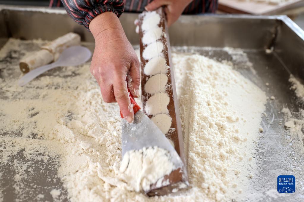 1月18日,貴州省遵義市務川仡佬族苗族自治縣丹砂街道桃符社區村民在制作當地特色點心酥食。制作酥食時,先將糯米打成粉,再加入融化的白糖液揉搓至稍有黏稠感,然后將其壓入模具里輕輕敲動、倒出,最后上鍋蒸熟即可。