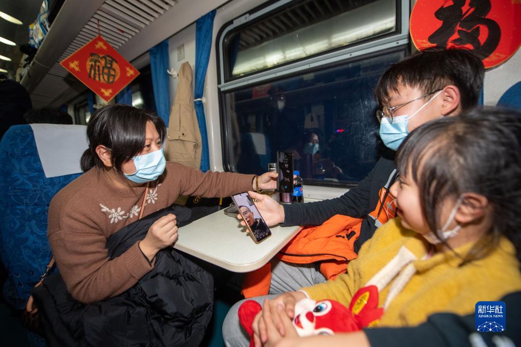 1月18日,回廣東韶關老家過年的旅客卜慧芬(左)在K209次列車上和兒子女兒一起與留守浙江的丈夫視頻通話。